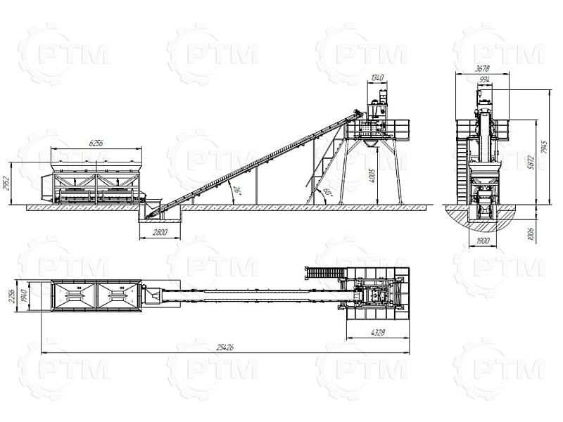 2. После набора нужного количества материалов инертные попадают на наклонный ленточный конвейер с шевронной лентой. Ширина ленты 600 мм, длинна конвейера 16 метров.