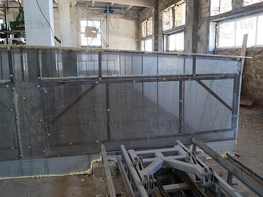 Транспортировка массива газобетона: Массив газобетона транспортируется по рельсовым путям с помощью электромеханического толкателя, из форм создается подобие поезда, одно основание толкает другое. Так происходит перемещение массива по заводу.