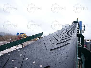 2. После набора нужного количества материалов инертные попадают на наклонный ленточный конвейер с шевронной лентой. Ширина ленты 600 мм, длинна конвейера 16 метров.