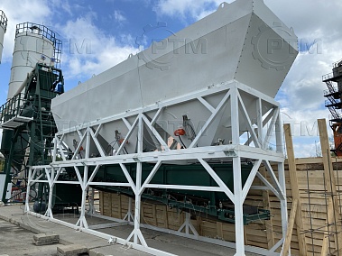 1. Дозирующий комплекс МБ-36 (2 секции по 12 м3): состоит из двух до четырех бункеров для хранения инертных материалов (щебень, песок, отсев). На каждом бункере имеется два пневмо- затвора, необходимых для точной дозации материалов. При дозировании материалы попадают на весовой ленточный конвейер, весовые датчики фирмы CAS Ю.Корея, при наборе нужного количества материалов, заслонки закрываются, подача прекращается. Объем каждого бункера от 2,5 м3 до 20 м3, в зависимости от комплектации завода. Каждый бункер оснащен вибродвигателем MVE 300/3.
